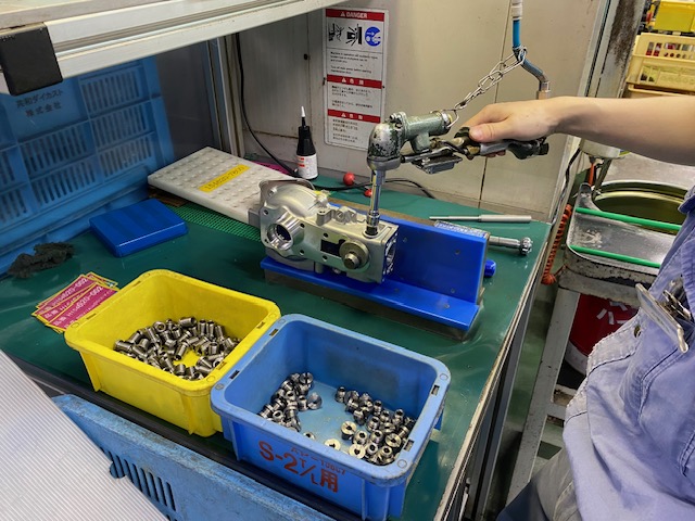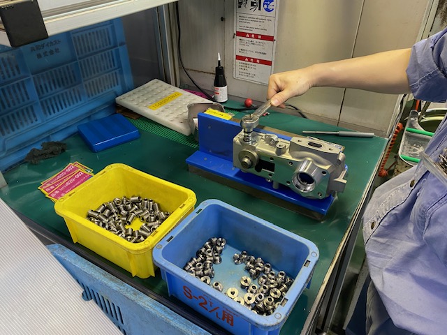 組付け工程では、加工済みの部品に対して専用治具を用いながら正確かつ効率的に組付け作業を行っています。