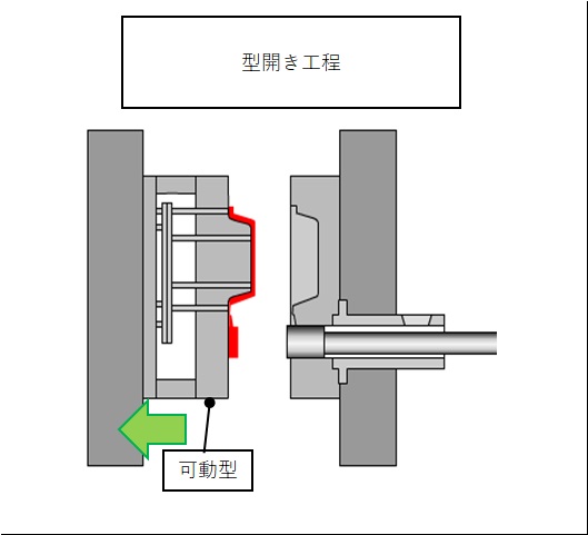 金型内部に設置された冷却回路により製品が冷やされると金型が開きます。